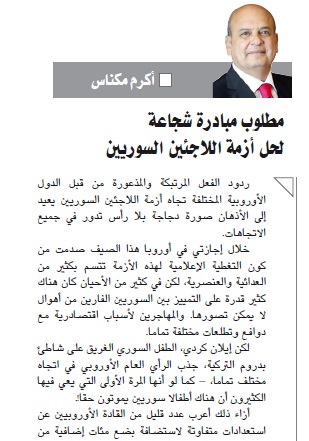 خلال إجازتي في أوربا هذا الصيف صدمت من كون التغطية الإعلامية لهذه الأزمة تتسم بكثير من العدائية والعنصرية، لكن في كثير من الأحيان كان هناك كثير قدرة على التمييز بين السوريين الفارين من أهوال لا يمكن تصورها. والمهاجرين لأسباب اقتصادرية مع دوافع وتطلعات مختلفة تماما.