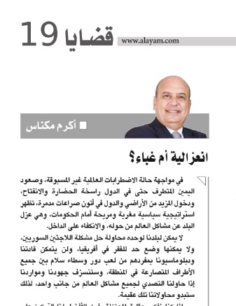 في مواجهة حالة الإضطرابات العالمية غير المسبوقة، وصعود اليمين المتطرف حتى في الدول راسخة الحضارة والانفتاح، ودخول المزيد من الأراضي والدول في أتون صراعات مدمرة، تظهر استراتيجية سياسية مغرية ومريحة أمام الحكومات، وهي عزل البلد عن مشاكل العالم من حوله، والانكفاء على الداخل.