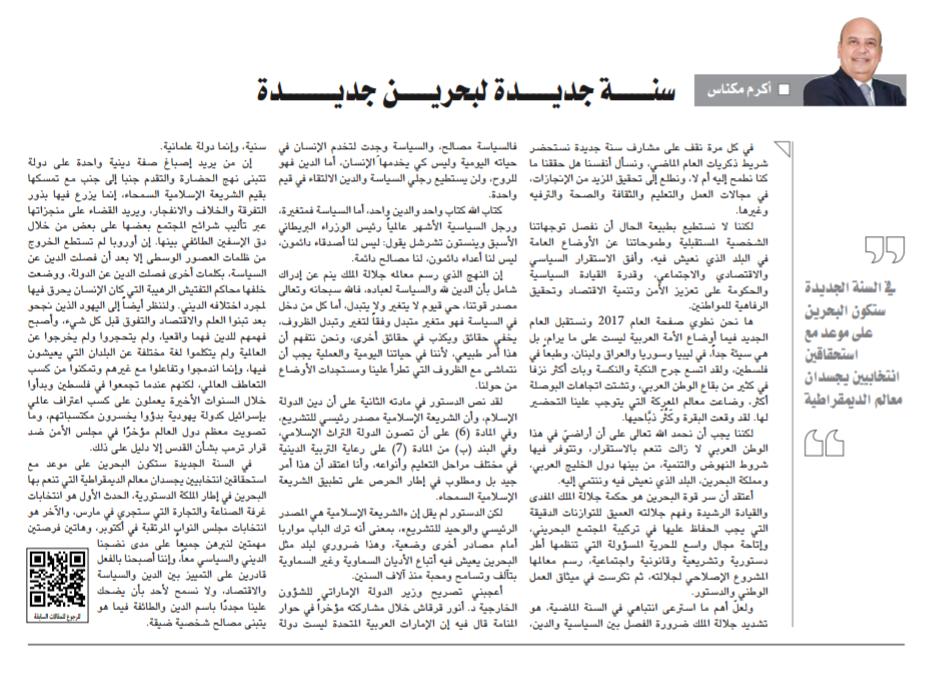 في السنة الجديدة ستكون البحرين على موعد مع استحقاقين انتخابيين يجسدان معالم الديمقراطية التي تنعم بها البحرين في إطار الملكة الدستورية، الحدث الأول هو انتخابات غرفة الصناعة والتجارة التي ستجري في مارس، والآخر هو انتخابات مجلس النواب المرتقبة في أكتوبر، وهاتين فرصتين مهمتين لنبرهن جميعا على مدى نضجنا الديني والسياسي معا، وأننا أصبحنا بالفعل قادرين على التمييز بين الدين والسياسية والاقتصاد، ولا نسمح لأحد بأن يضحك علينا مجددا باسم الدين والطائفة فيما هو يتبنى مصالح شخصية ضيقة.